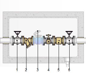 Preinstalación de medidor general de agua 1/2" DN 15 mm, colocado en hornacina, conectado al ramal de acometida y al tubo de alimentación, formada por llave de corte general de compuerta de latón fundido; grifo de comprobación; filtro retenedor de residuos; válvula de retención de latón y llave de salida de compuerta de latón fundido. Incluso marco y tapa de fundición dúctil para registro y material auxiliar.