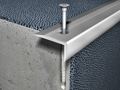 Remate de peldaño con revestimiento flexible o textil, mediante perfil en L perforado de aluminio anodizado, de 40x20 mm, color plata, con muescas antideslizantes, fijado mecánicamente. |
