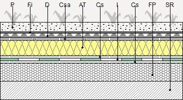 Cubierta plana no transitable, no ventilada, ajardinada. Impermeabilización con láminas de PVC. |
