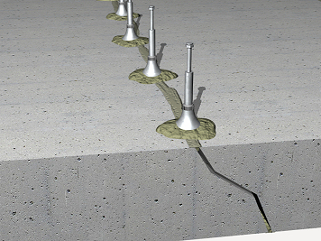 Colocación, cada 20 cm, de inyectores externos con adhesivo tixotrópico de dos componentes a base de resina epoxi, en fisura de elemento de concreto, y sellado superficial de la fisura, con el mismo material. |